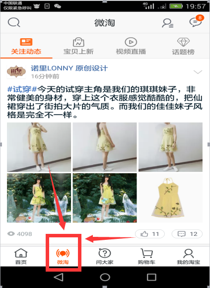 我们可以看到微淘页面显示的店铺新发布,试穿秀,内容写的很好,照片也很漂亮,用两个不同类型的漂亮妹纸来试穿,不仅款式很新颖,还有种高大上的感觉,是不是很吸引眼球呢
