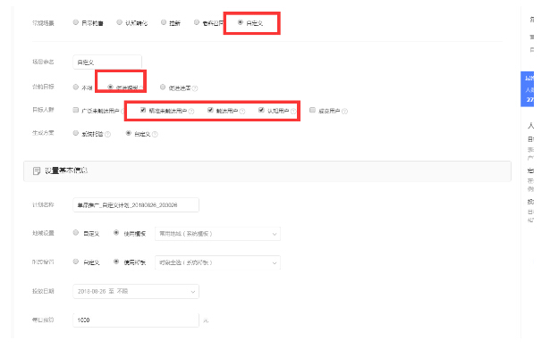 4、 营销场景-自定义, 营销目标-促进购买, 目标人群-精准未触达用户-触达用户-认知用户,地域除开偏远和港澳游其他全选,时段全选,预算根据自己资金来设置。