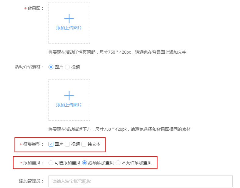 6、之后就是设置背景图片以及相关征集类型,征集类型建议是图片和视频都选择,根据不同的情况来添加宝贝,选择必须添加宝贝,活动介绍素材是需要上传一张图片作为活动页面的海报,当然是有两种选择,第一种是可以直接放一些真人美拍,第二种可以把活动的奖品写在图片上面,都是可以的,最后点击确定,我们的活动也就创建好了。